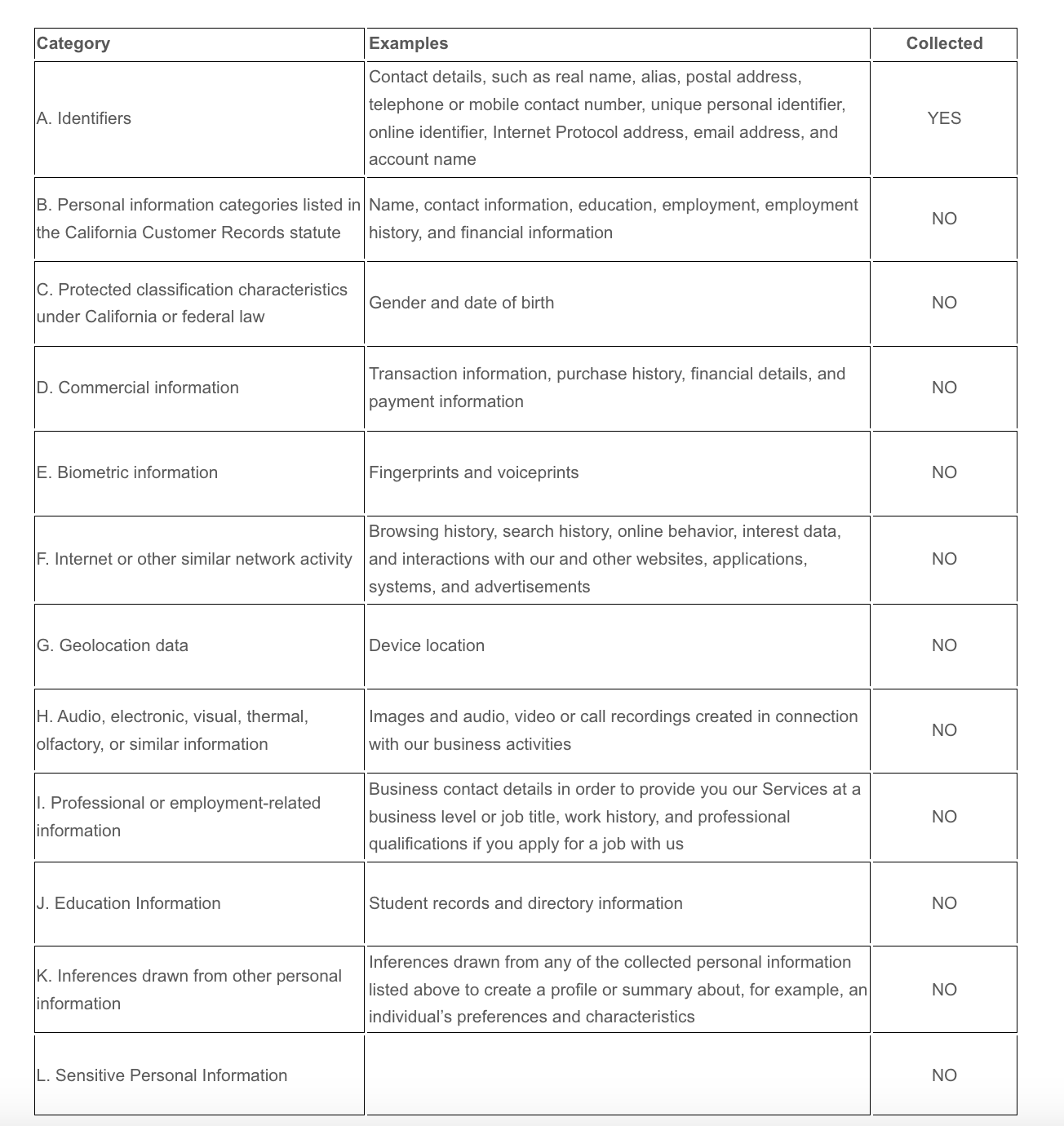 We have collected the following categories of personal information in the past twelve (12) months: